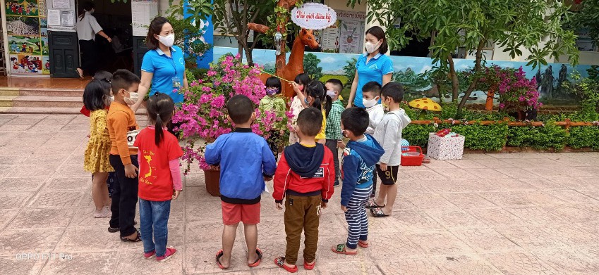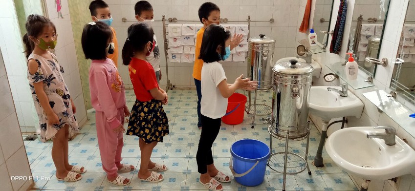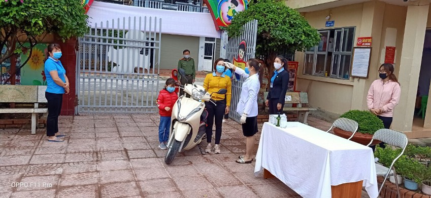 Để đảm bảo an toàn cho trẻ, ngay từ những ngày đầu đón trẻ trở lại trường nhà trường đã chuẩn bị đầy đủ trang thiết bị, vật tư y tế phục vụ công tác phòng dịch: máy đo thân nhiệt, dung dịch sát khuẩn, khẩu trang y tế….Vào đầu mỗi buổi học,  Ban Giám hiệu cùng giáo viên nhà trường đã triển khai các phương án đón học sinh từ cổng trường, đo thân nhiệt và hướng dẫn vệ sinh tay cho các trẻ bằng nước sát khuẩn, yêu cầu các bậc cha mẹ học sinh dừng tại cổng, không vào trong khuôn viên trường học. Nhắc nhở giáo viên thường xuyên hướng dẫn học sinh cách rửa tay theo 6 bước, kiểm tra sức khỏe, lau nền nhà, tay nắm cửa, đồ chơi, dụng cụ học tập và các đồ vật trong phòng học, phòng chức năng bằng các chất tẩy rửa thông thường như xà phòng hoặc các dung dịch khử khuẩn khác.