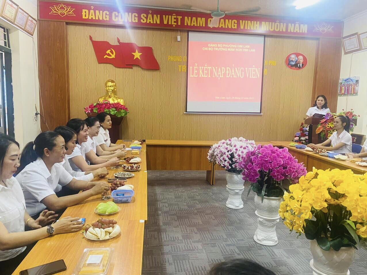 Thực hiện Nghị quyết của Đại hội Chi bộ Trường mầm non Him Lam về việc phát triển Đảng viên. Chiều ngày 20/11/2023, Chi bộ Trường mầm non Him Lam đã long trọng tổ chức lễ kết nạp Đảng viên mới đối với quần chúng ưu tú: Nguyễn Thị Thu Phương. Đây là sự kiện có ý nghĩa quan trọng trong công tác xây dựng Đảng, góp phần phát triển, nâng cao chất lượng và sức chiến đấu của Chi bộ nhà trường nói chung và các cá nhân Đảng viên nói riêng.Lễ kết nạp đảng viên được diễn ra trong không khí trang nghiêm, đúng trình tự, thủ tục của Điều lệ Đảng Cộng sản Việt Nam và Hướng dẫn số 01-HD/TW ngày 28/9/2021 của Ban Chấp hành Trung ương.