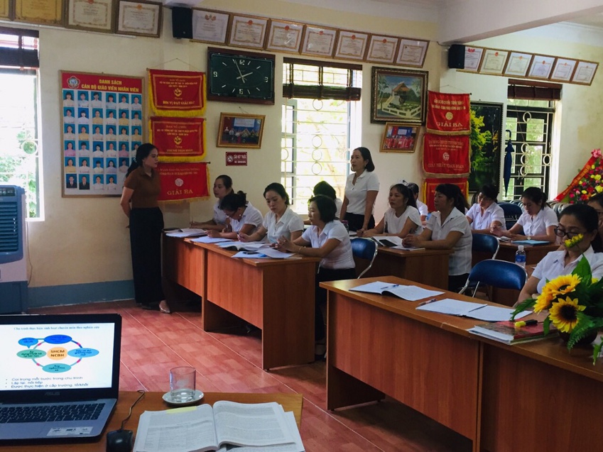 Thực hiện theo kế hoạch số 657/KH – PGDĐT ngày 12/08/2020 của Phòng giáo dục và đào tạo về việc bồi dưỡng thường xuyên cho giáo viên, CBQL cơ sở giáo dục và bồi dưỡng triển khai thực hiện Chương trình giáo dục phổ thông 2018, năm học 2020-2021; Công văn chỉ đạo số 674/ PGDĐT của Phòng giáo dục và đào tạo ngày 18 tháng 08 năm 2020 về việc điều chỉnh kế hoạch mở các lớp bồi dưỡng cán bộ quản lý, giáo viên, nhân viên trong hè. Thực hiện theo đúng tinh thần chỉ đạo của công văn, ngày 27 và 28/8/2020 đồng chí Lò Thị Hồng Nhung – Phó hiệu trưởng nhà trường, sau khi đi tiếp thu kiến thức tập huấn từ lớp cốt cán của Sở giáo dục đã tiến hành tổ chức bồi dưỡng thường xuyên cho tập thể CBQL, GV đồng thời tiếp tục thực hiện tốt 1 số biện pháp phòng chống dịch bệnh Covid - 19 theo đúng tinh thần chỉ đạo của Phòng giáo dục tại đơn vị mình…..
