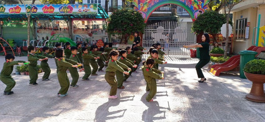 Nhà trường đã hưởng ứng đẩy mạnh các phong trào thi đua, đặc biệt là phong trào thi đua “Dạy tốt - Học tốt” các tiết dạy được đầu tư về nội dung và hình thức, cũng như về phương pháp chuyên môn. Đặc biệt giáo viên tổ chức tuyên truyền tốt tới trẻ về ngày lễ trọng đại này qua các hoạt động phong trào như: Thể dục sáng, sinh hoạt tập thể, những giờ học trên lớp….Tích cực trao đổi với phụ huynh về nội dung chương trình giáo dục mầm non, làm nổi bật chủ đề của tháng của tuần (Ngày hội của các chú bộ đội)…..