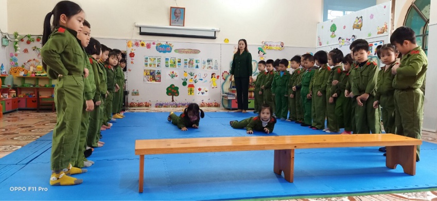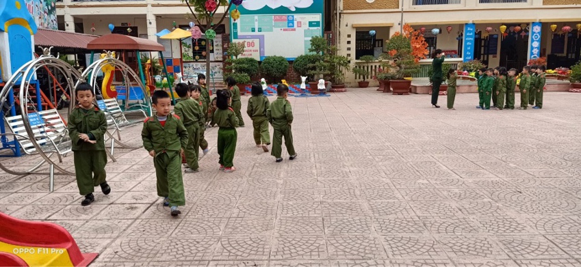 Không chỉ thông qua các hoạt động học, các trò chơi, hoạt động ngoài trời, sinh hoạt tập thể, hoạt động góc, hoạt động lao động…mà các bé còn được hóa thân thành các chú bộ đội thật sự, được trải nghiệm qua các hoạt động: Chú bộ đội diễu hành, tập nghi thức, chú bộ đội nấu ăn…qua đó giúp các bé hiểu về công việc hàng ngày của các chú bộ đội, từ đó khơi gợi lên tình yêu, lòng tự hào về các chú bộ đội, những người chiến sỹ Quân đội nhân dân Việt Nam.